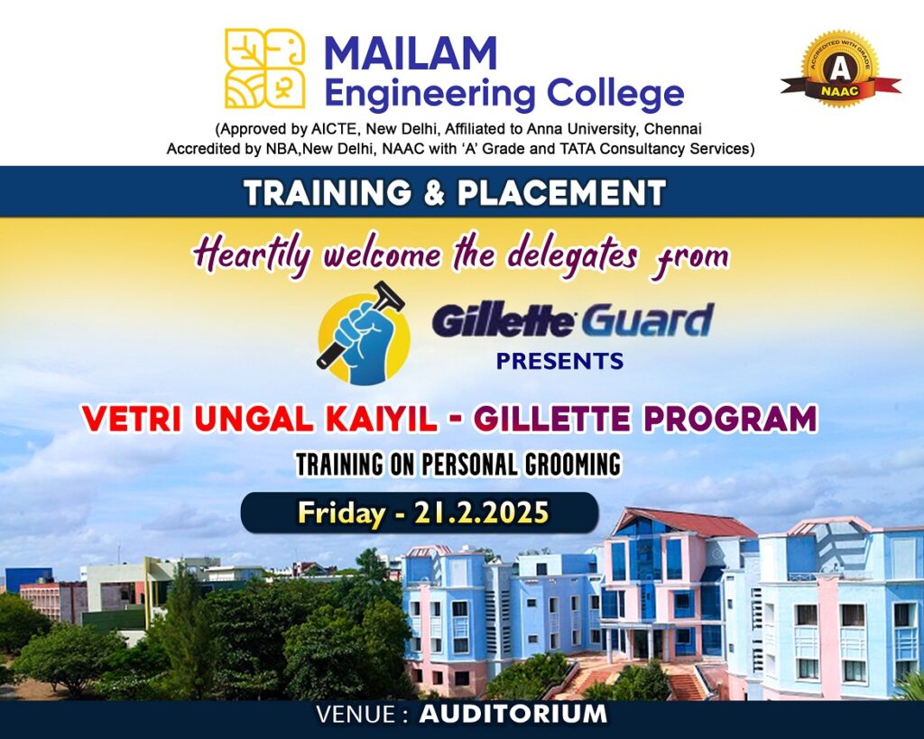 Our College Training and placement cell organized Vetri Un Kayil- Gillette company Program on 21.02.2025 for all II year, III year Boys students. Outcome: To improve behavior of students, interpersonal skills. A gillete guard worth Rs.25 is given to all the participants at free of cost.