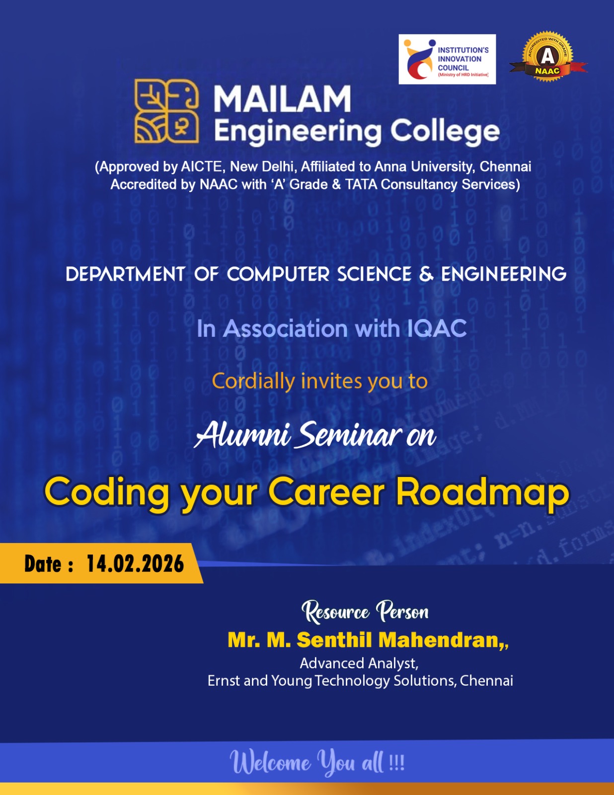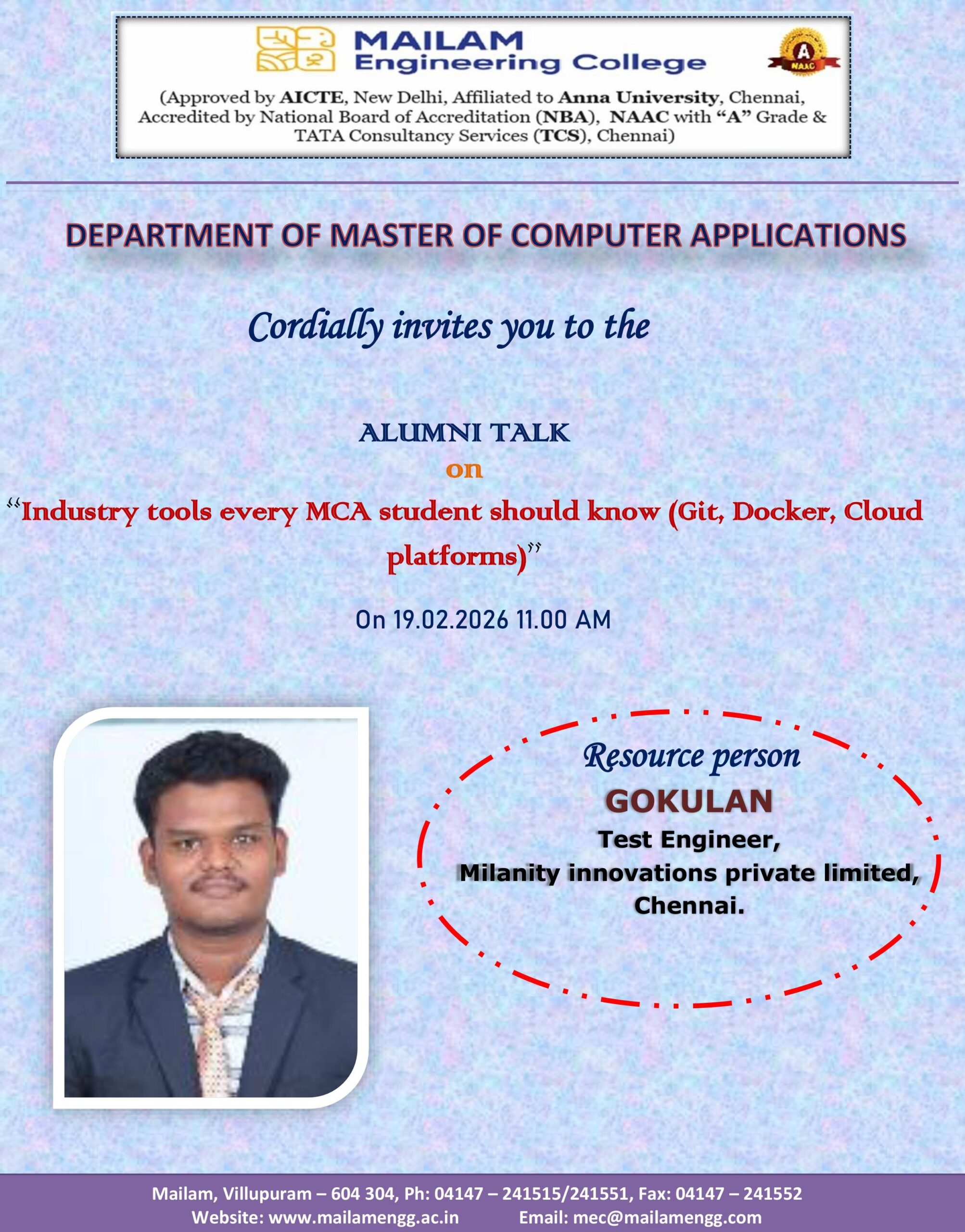 It is a mandatory thing in the department of MCA to conduct alumni meet every year and make the alumni to share their work and experience with our ongoing students.