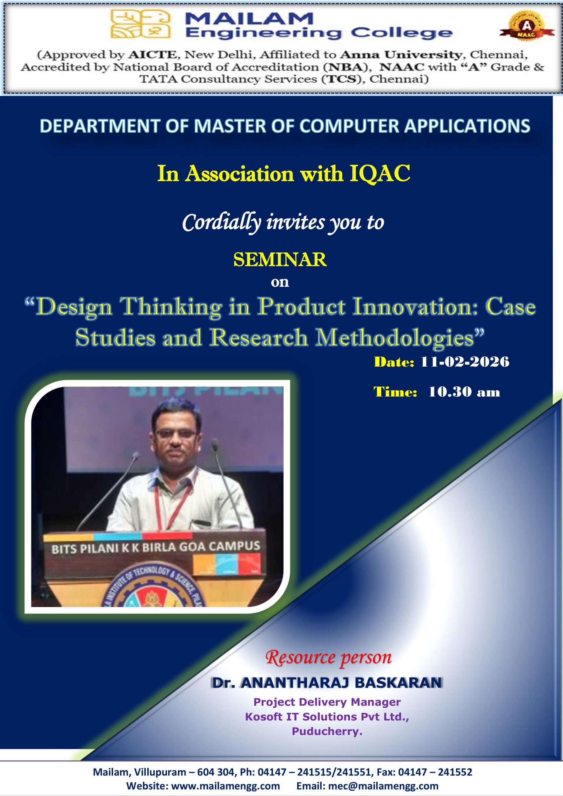 The Department of Master of Computer Applications is organising a Silver Jubilee Celebration Event to conduct a one-day seminar entitled “PROFESSIONAL SKILL DEVELOPMENT FOR ENTREPRENEUR” for the students of the MCA Department. The resource person for the Seminar is Dr. G. Seenuvasan, MCA, M.Phil., Master Trainer-EDII-TN. on 02.12.2023.