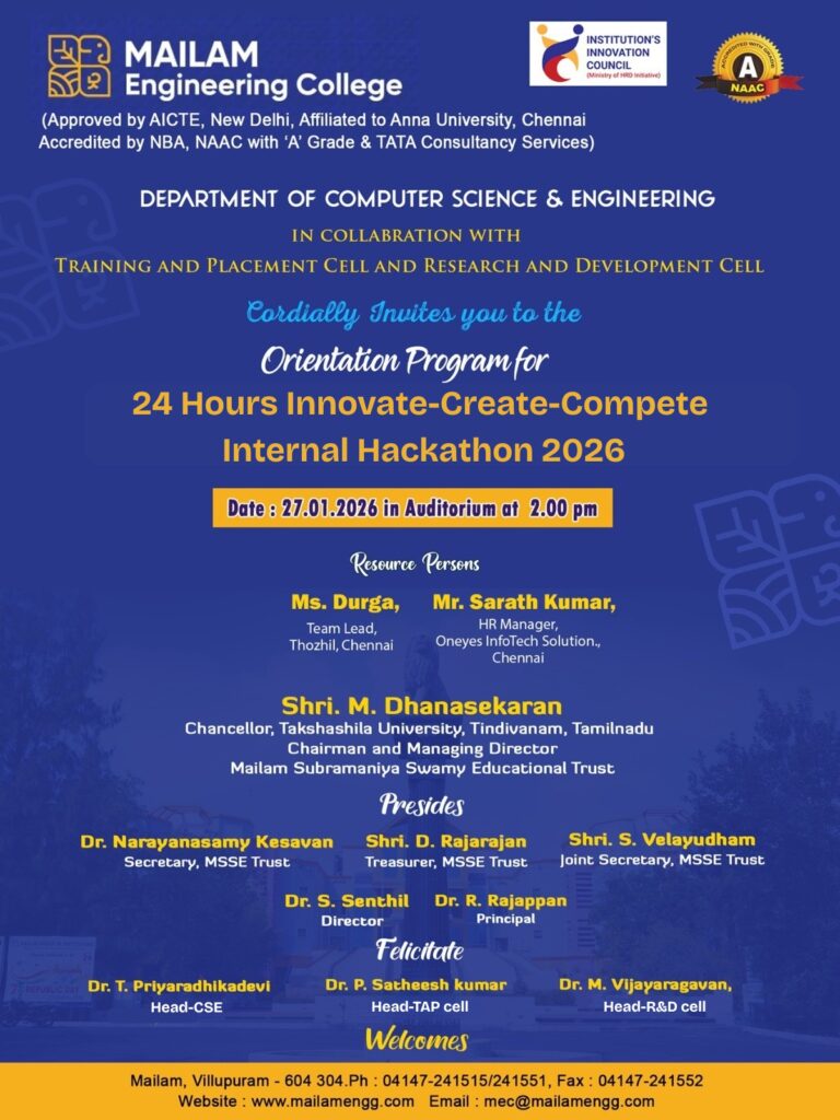 The Department of Computer Science & Engineering, Mailam Engineering College, in collaboration with the Training & Placement Cell and Research & Development Cell, invites students to the Orientation Program for the 24-Hour Innovate–Create–Compete Internal Hackathon 2026. Join industry experts, gain insights into problem-solving, teamwork, and innovation, and get ready to build impactful solutions.
