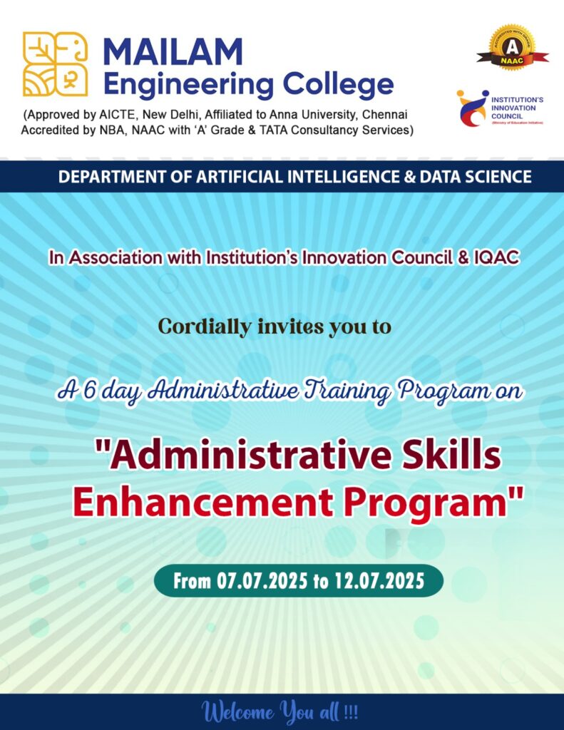 The Department of Artificial Intelligence and Data Science, in association with the Institution’s Innovation Council (IIC) and IQAC, organized a 6-day Administrative Training Program titled “Administrative Skills Enhancement Program” from 7th to 12th July 2025. This program was designed to enhance the professional and administrative skills of the non-teaching staff of Mailam Engineering College, fostering improved efficiency and workplace effectiveness.