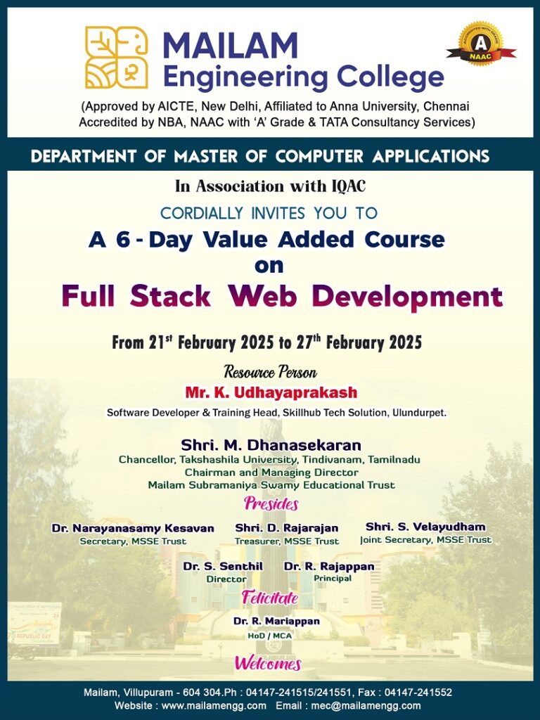 The Department Master of Computer Applications is organizing a 6 Day Value Added Course on 'FULL STACK WEB DEVELOPMENT' from 21 February to 27 th February 2025.