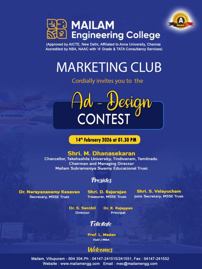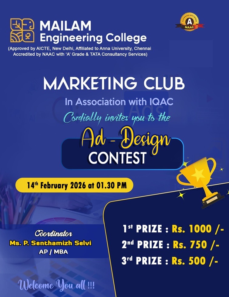 The Marketing Club, in association with IQAC, is organizing an “Ad-Design Contest” on 14th February 2026 at 01:30 PM for UG and PG students.