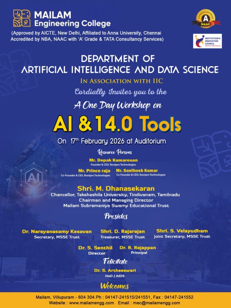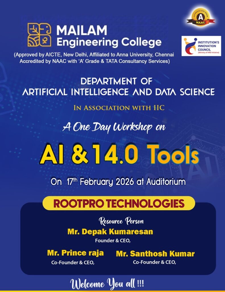 The Department of Artificial Intelligence and Data Science is excited to present “AI & 14.0 Tools,” a special seminar conducted by esteemed industry leaders—Mr. Depak Kumaresan, Founder & CEO, Mr. Prince Raja, Co-founder & CEO, and Mr. Santhosh Kumar, Co-founder & CEO. Join us on 17.02.2026 to explore cutting-edge AI tools and gain insights into the future of AI and Data Science. This seminar is a unique opportunity to learn from experts, understand the latest trends, and enhance your knowledge in the world of AI.