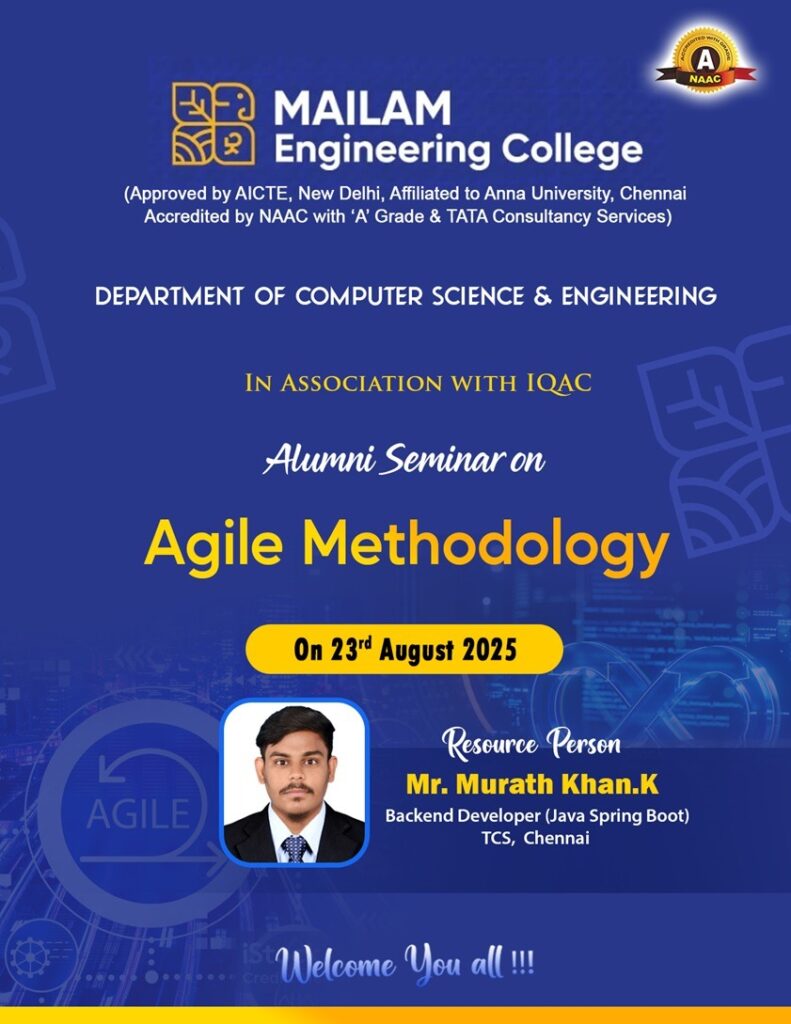 The Department of Computer Science and Engineering, in association with IQAC, is organizing an Alumni Seminar on Agile Methodology for second-year CSE students of Mailam Engineering College. The special talk will be delivered by Mr. Murath Khan.K, Backend Developer (Java Spring Boot), TCS, Chennai on 23rd August 2025. This seminar aims to provide students with valuable industry insights on Agile practices and their real-world applications in software development.
