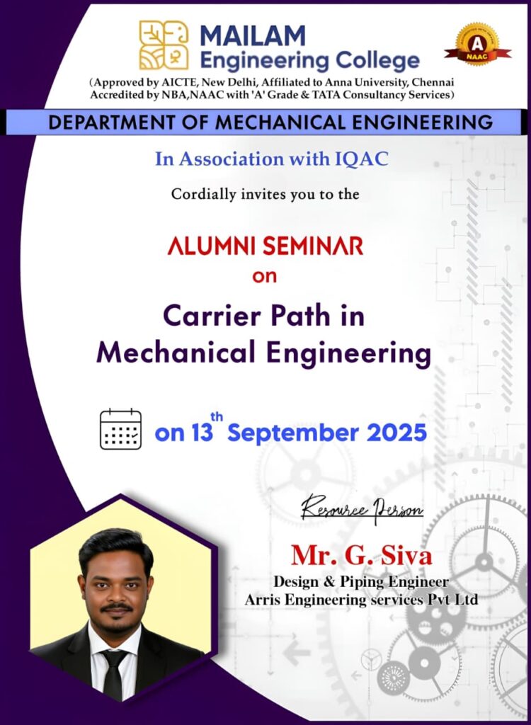 The Department of Mechanical Engineering, in association with IQAC, is organizing an Alumni Seminar on “Career Path in Mechanical Engineering” exclusively for third-year Mechanical students. The session, scheduled for 13th September 2025, will provide valuable guidance, industry insights, and real-world experiences from alumni to help students shape their future career paths.
