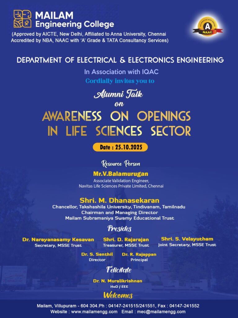 The Department of Electrical and Electronics Engineering at Mailam Engineering College, in association with IQAC, is hosting an alumni talk titled “Awareness on Openings in Life Sciences Sector” on October 25, 2025.
