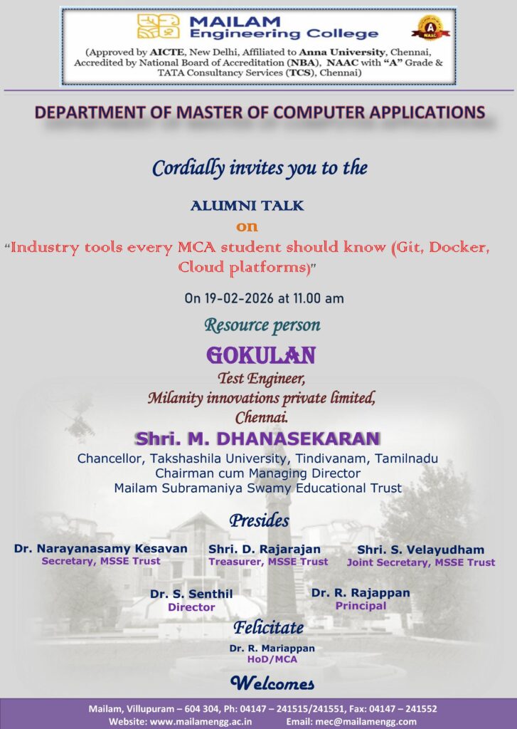 The Department of Master of Computer Applications is organizing an Alumni Talk on “Industry Tools Every MCA Student Should Know” on 19th February 2026 at 11:00 AM. The session will cover essential industry tools such as Git, Docker, and various cloud platforms that are integral to the modern software development lifecycle. Our alumni will share their real-world experiences and insights on how these tools enhance productivity, collaboration, and deployment in the tech industry. Don’t miss out on this opportunity to learn from industry experts and gain a competitive edge in your career!