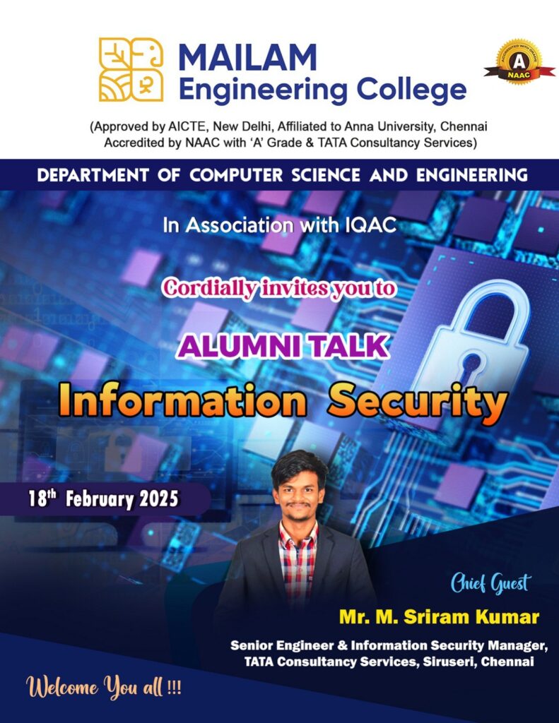 The Department of Computer Science and Engineering is organized "Alumni Talk"on "Information Security " by Mr.M.Sriram kumar, Senior Engineer & Information Security Manger, TCS ,siruseri,Chennai University ,Newdelhi on 18.02.2025.
