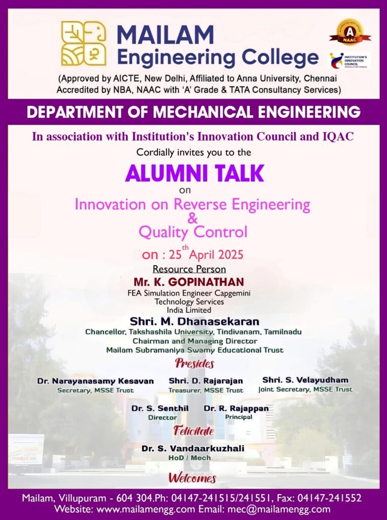 The Department of Mechanical Engineering is organizing a Alumni Talk on “Innovation on Reverse Engineering & Quality Control " for Mechanical Engineering students on 25th April 2025.