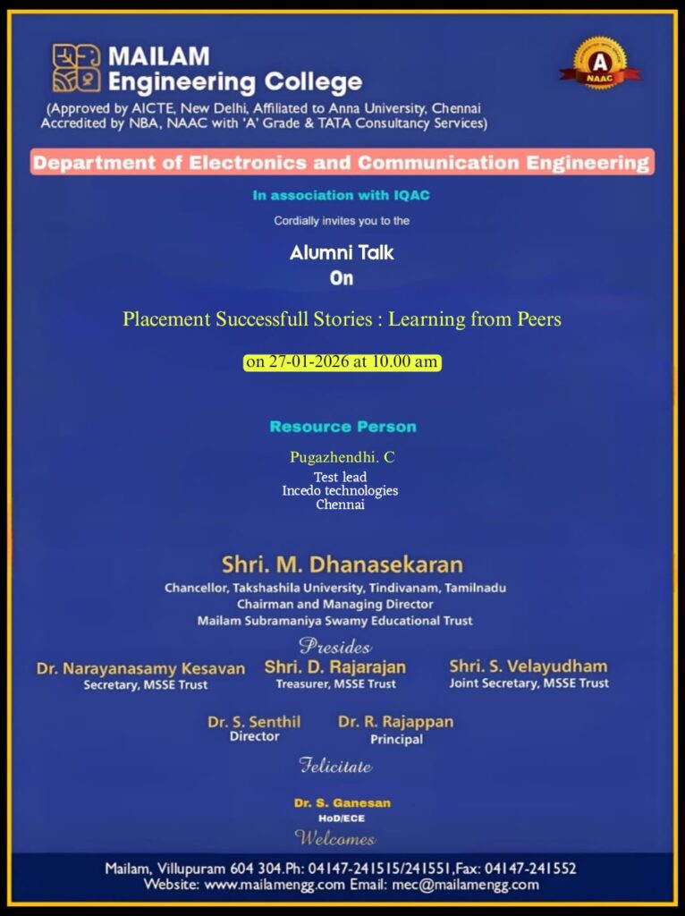 The Department of Electronics and Communication Engineering is organizing an Alumni Talk on Placement Success Stories on 27 January 2026 at 10.00 a.m. The session aims to share real placement experiences, career insights, and guidance to help students prepare effectively for their professional journey.