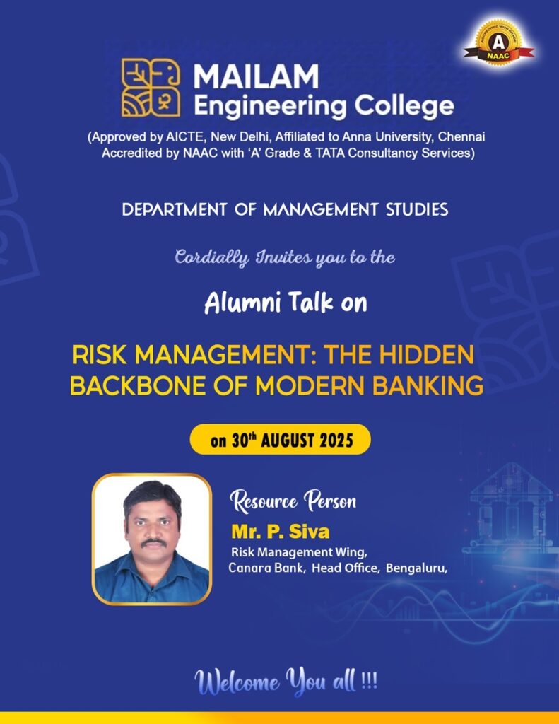The Department of Management Studies is organizing an Alumni Talk exclusively for second-year MBA students on August 30, 2025. The session will feature Mr. Siva. P, from the Risk Management Wing, Canara Bank, Head Office, Bangalore, who will share his expertise on the critical role of risk management in today’s banking sector.