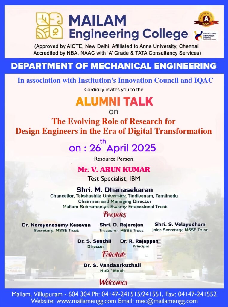 The Department of Mechanical Engineering is organizing a Alumni Talk on “The Evolving Role of Research for Design Engineers in the Era of Digital Transformation " for Mechanical Engineering students on 26th April 2025.