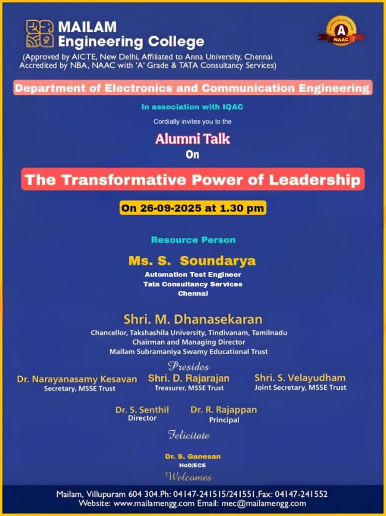 Mailam Engineering College’s Department of Electronics and Communication Engineering, in association with IQAC, is hosting an Alumni Talk on 26-09-2025 at 1:30 PM. The resource person is Ms. S. Soundarya, Automation Test Engineer, Tata Consultancy Services, Chennai.