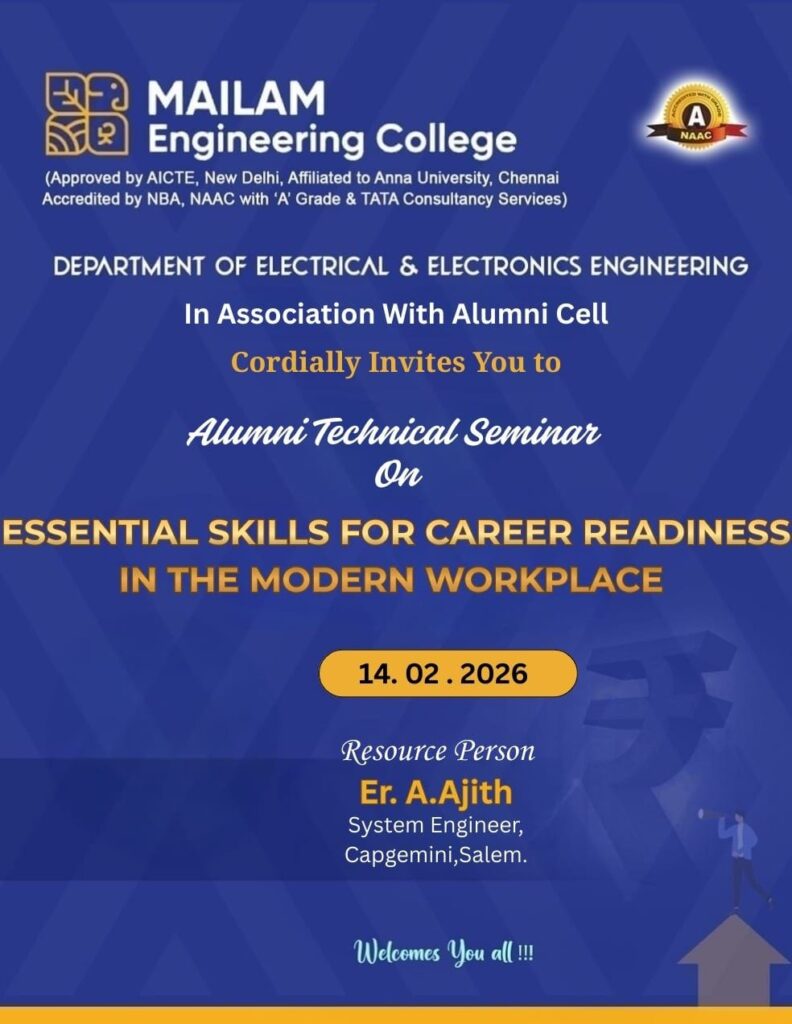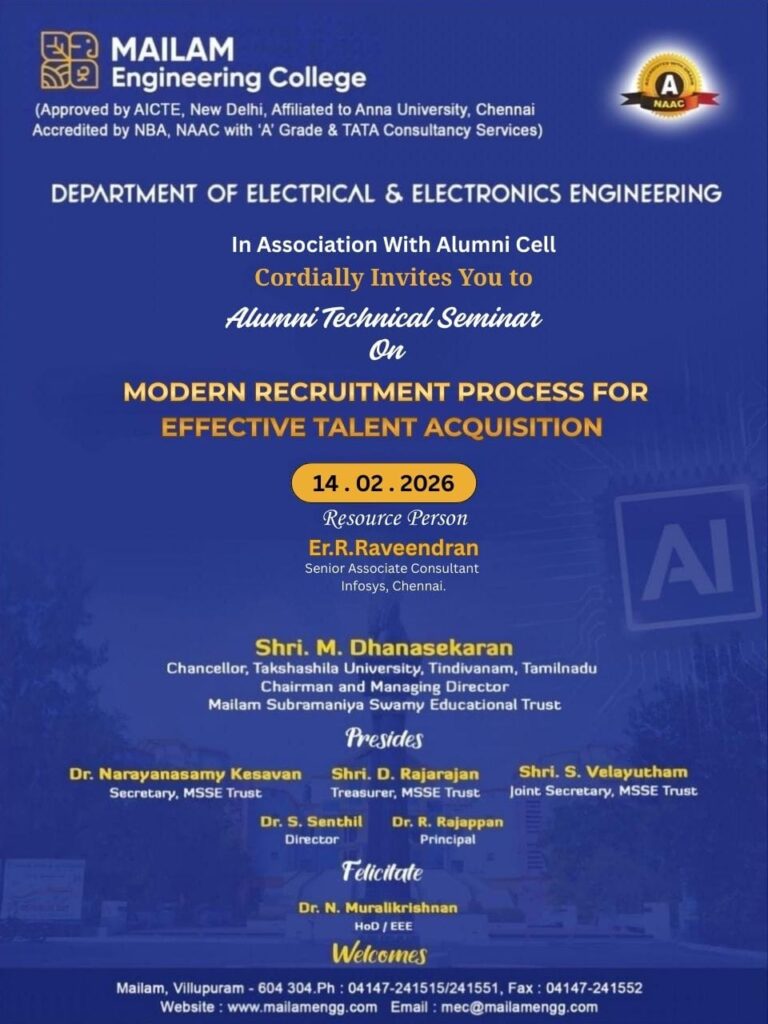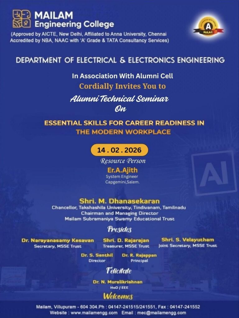 Join us for an insightful Alumni Technical Seminar, organized by the Department of Electrical and Electronics Engineering (EEE), designed for III and II-year students. This seminar offers a platform to engage with successful alumni, who will share their technical expertise, career journeys, and industry insights. It’s a great opportunity for students to gain valuable knowledge, ask questions, and explore the latest trends in EEE, helping shape their academic and professional futures.