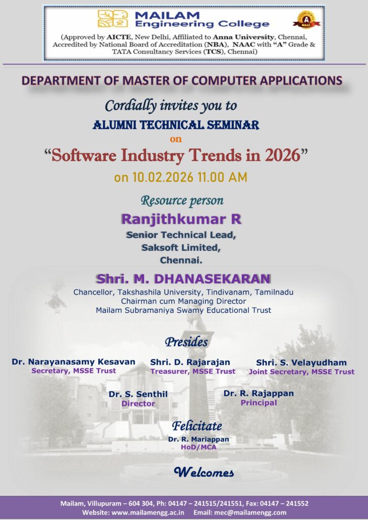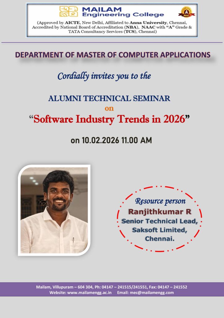 The Department of Master of Computer Applications is organizing an Alumni Technical Seminar on “Software Industry Trends in 2026” for MCA students on 10th February 2026 at 11 AM. The seminar will provide valuable insights into the latest trends, technologies, and career opportunities in the rapidly evolving software industry. Don’t miss this opportunity to stay ahead in the tech field!