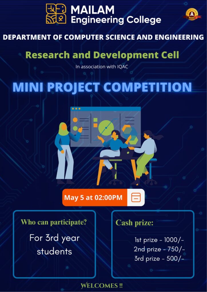 The Department of Computer Science and Engineering in association with IQAC Reasearch and Development Cell is organized“Mini project Competition” for CSE Third year students on 05.05.2025