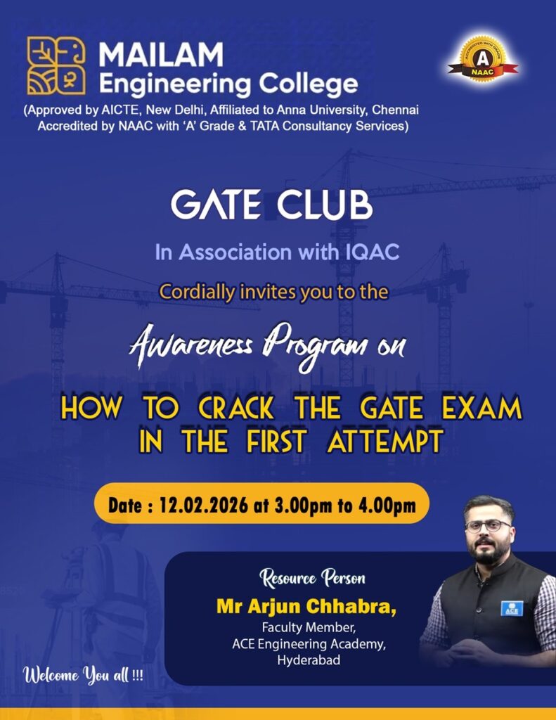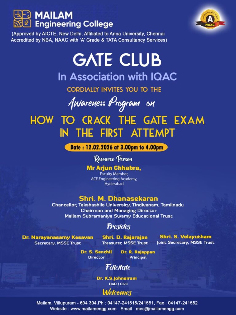 The GATE Club is organizing an awareness program titled “How to Crack the GATE Exam in the First Attempt” on 12 February 2026 at 3:00 PM.
