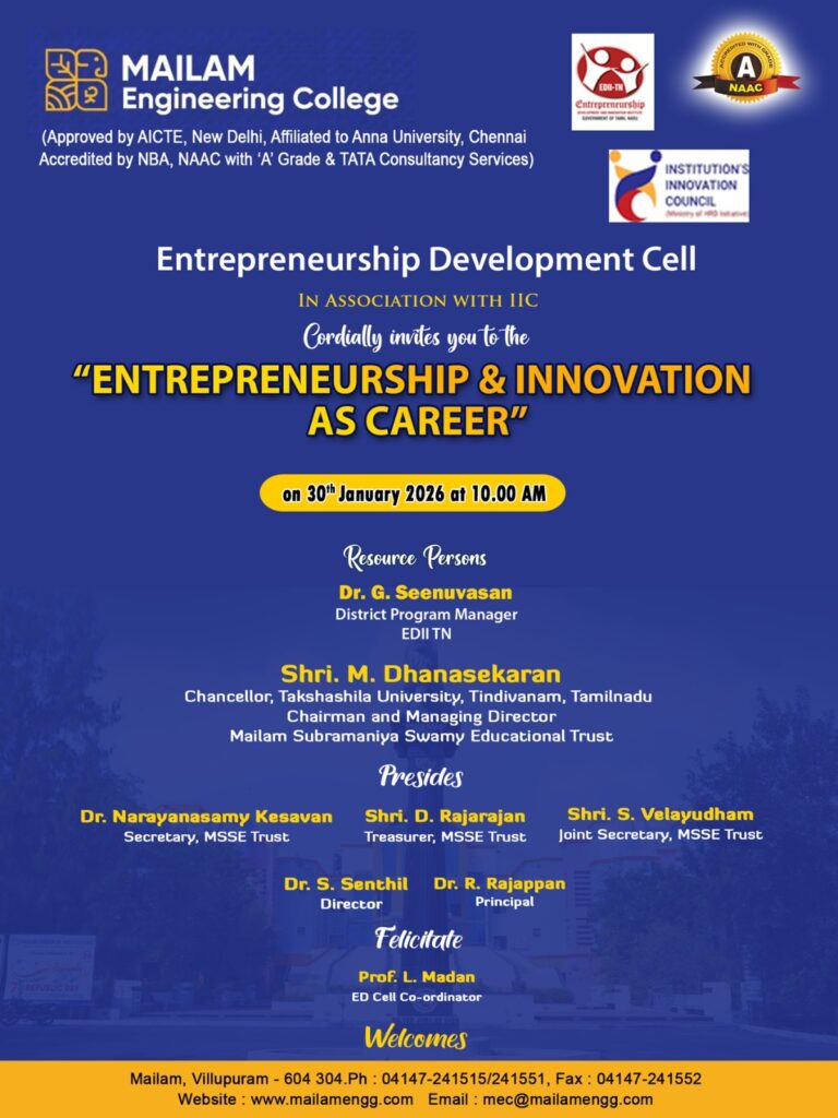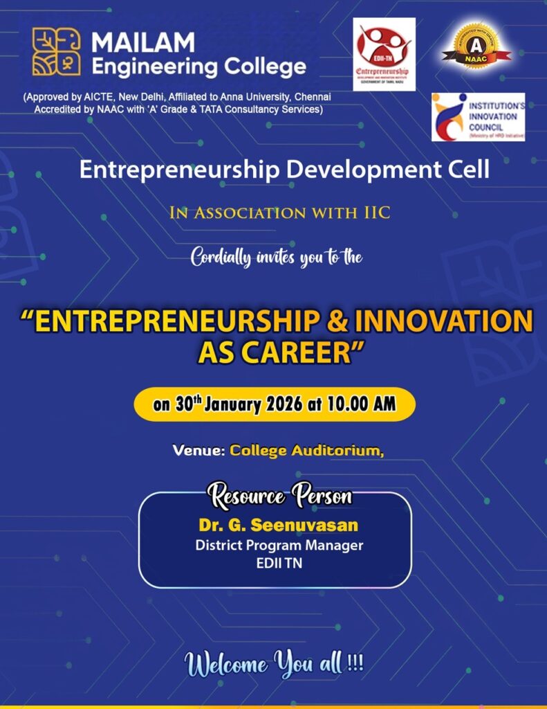 The Entrepreneurship Development Cell, in collaboration with the Institution’s Innovation Council, organized an Awareness Workshop titled “Entrepreneurship and Innovation as Career” on 30-01-2026. This session aimed to inspire and guide students on exploring entrepreneurship and innovation as viable career paths.