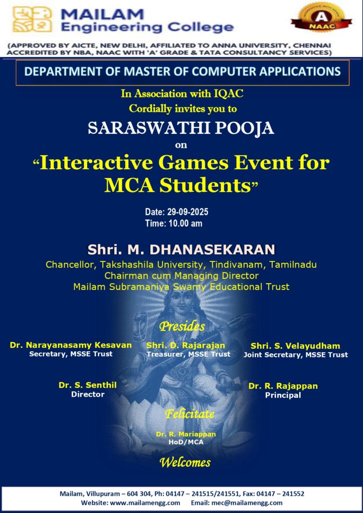 The Department of Master of Computer Applications at Mailam Engineering College is hosting the Ayutha Pooja Celebration with an Interactive Games Event for MCA students on September 30th, 2025, starting at 10:00 am. The event will include a series of fun and engaging interactive games to foster team spirit and creativity among students. The ceremony will be presided over by esteemed leaders, including Shri. M. Dhanasekaran, Chancellor of Takshashila University. It’s a wonderful occasion to celebrate Ayutha Pooja and strengthen bonds within the MCA community. Don’t miss out on the excitement and camaraderie!