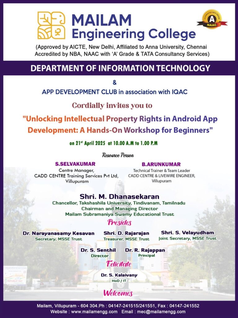 The Department of Information Technology and App Development Club in association with IQAC organizes the workshop entitled "Unlocking Intellectual Property Rights in Android App Development: A Hands-on Workshop for Beginners" for UG Students on 21.04.2025