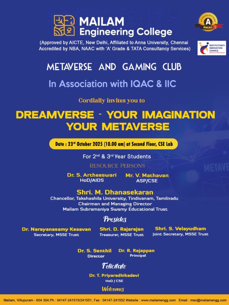 The Department of Computer Science and Engineering at Mailam Engineering College, through the Metaverse and Gaming Club in association with IQAC and IIC, is organizing an engaging event titled Dreamverse – Your Imagination, Your Metaverse.