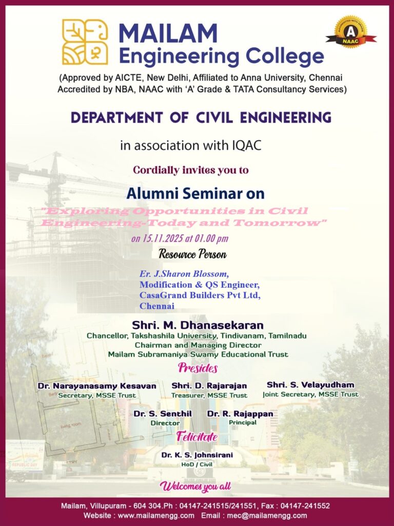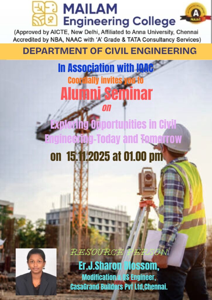 The Department of Civil Engineering is organizing an Alumni Seminar on November 15, 2025, titled “Exploring Opportunities in Civil Engineering – Today and Tomorrow.” This seminar will feature a special talk by Er. J. Sharon Blossom, Modification & QS Engineer at CasaGrand Builders Pvt Ltd, Chennai. Er. Blossom will discuss the evolving landscape of civil engineering and the wide range of career opportunities available in the field, both now and in the future. This seminar offers a unique chance for students and professionals to gain valuable insights into the growth and innovation in civil engineering.