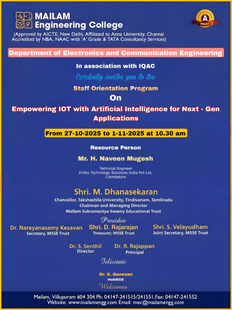 The Department of Electronics and Communication Engineering at Mailam Engineering College, in association with IQAC, is organizing a Faculty Orientation Program titled “Empowering IoT with Artificial Intelligence for Next-Gen Applications” from October 27, 2025, to November 1, 2025, starting each day at 10:30 a.m.