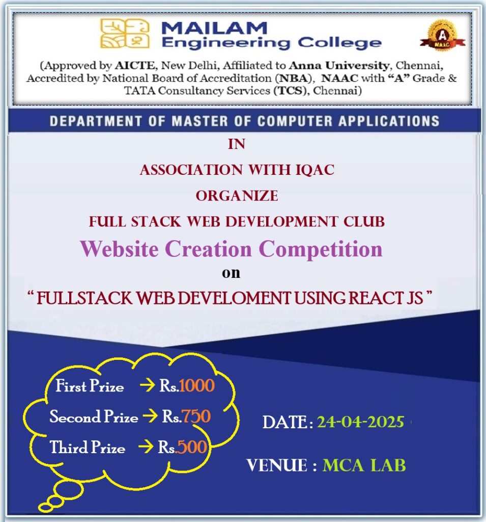 The Department of Master of Computer Applications is conduct Website Creation Competition on “FULL STACK WEB DEVELOPMENT USING REACT JS” for the students of MCA, CSE, IT, AIDS and CSBS through Full Stack Web Development Club on 24th April 2025 at 02.00 PM.