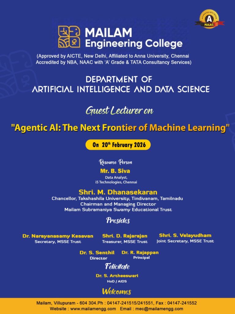 The Department of Artificial Intelligence and Data Science organized a guest lecture titled “Agentic AI: The Next Frontier of Machine Learning” on 20.02.2026. The session was delivered by B. Siva, Data Analyst at i5 Technologies, Chennai.