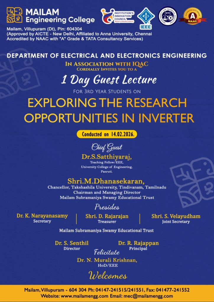 The Department of Electrical and Electronics Engineering (EEE) is organizing a Guest Lecture on “Exploring the Research Opportunities in Inverter Technology” on 14 February 2026.