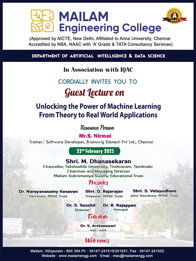 The Department of Artificial Intelligence and Data Science conducted Guest Lecture on “Unlocking the power of Machine Learning - From Theory to Real World Applications” by Mr. S. Nirmal, Trainer/Software Developer, Brainswig Edutech Pvt Ltd, Chennai