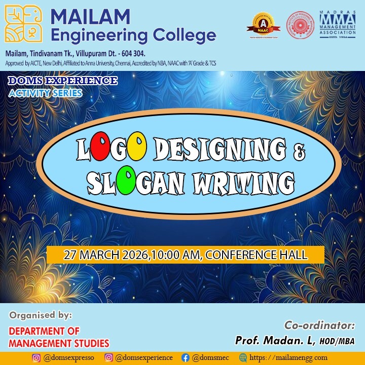 Join the Department of Management Studies for Logo Designing, Slogan Writing, and Product Photography events as part of the DOMS Experience Activity Series on 27th March 2026. Showcase your creativity and skills!