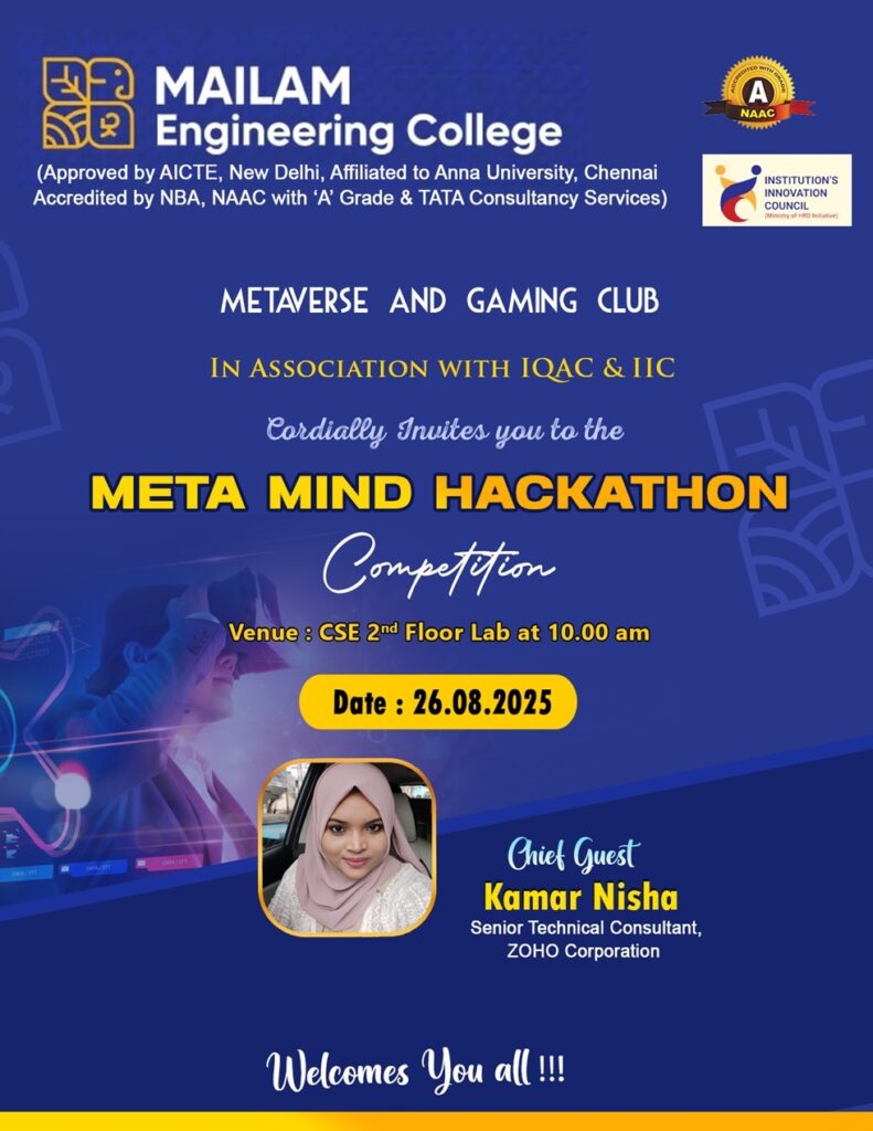 The Department of Computer Science and Engineering, in association with IQAC and IIC, is organizing the Meta Mind Hackathon under the Metaverse and Gaming Club. The event will be graced by Ms. Kamar Nisha, Senior Technical Consultant, ZOHO Corporation, Chennai, as the Chief Guest. This exciting hackathon is open to all MEC students and will provide a platform to showcase innovation, creativity, and problem-solving skills in the emerging fields of the Metaverse and Gaming.