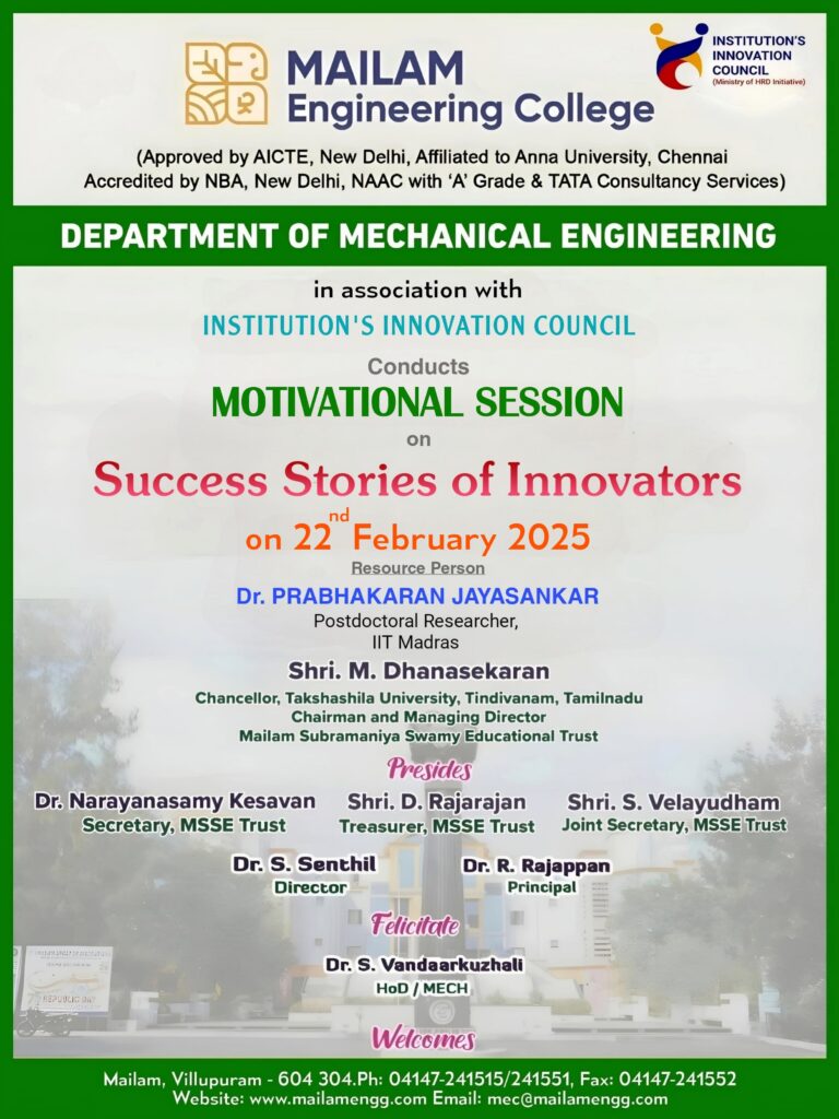 The Department of Mechanical Engineering is organizing a Motivational Session through Institution Innovation Council for Mechanical students on 22nd February 2025.