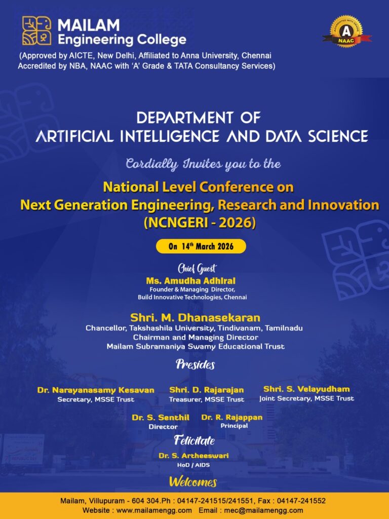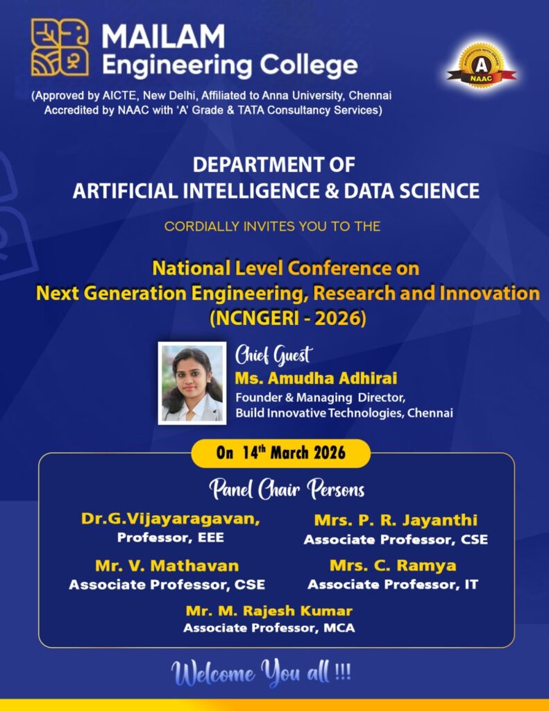 The Department of Artificial Intelligence and Data Science is organizing a National Level Conference on Next Generation Engineering, Research and Innovation on 14 March 2026, delivered by Ms. Amudha Adhirai, Founder and Managing Director of Build Innovative Technologies, Chennai.