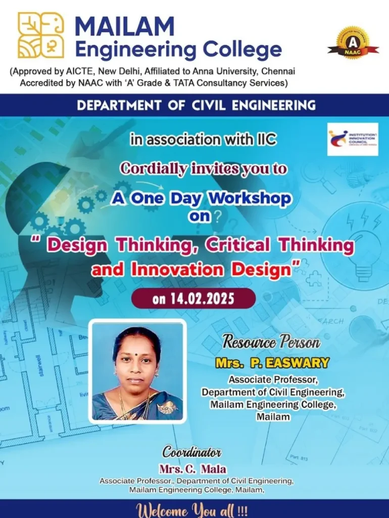 Department of Civil Engineering Conducted a one-day workshop on “Design Thinking, Critical Thinking and innovation Design“ by Mrs. P. Easwary on 14.02.2025
