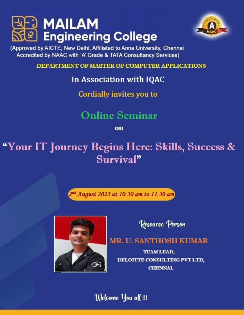 The Department of Master of Computer Applications at Mailam Engineering College, in association with IQAC, is organizing an online seminar on “Your IT Journey Begins Here: Skills, Success & Survival” for MCA students. The session will be conducted by Mr. U. Santhosh Kumar, Team Lead at Deloitte Consulting Pvt. Ltd., Chennai, on 2nd August 2025, from 10:30 AM to 11:30 AM. This seminar aims to provide valuable insights into building a successful career in IT, covering essential skills, strategies for growth, and surviving in a competitive industry.