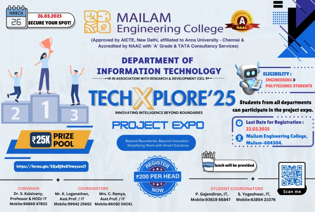 The Department of Information Technology organizes a Project Expo “TechXplore’25” on 26.03.2025 Click here. More info. visit Techxplore’25 online registration.