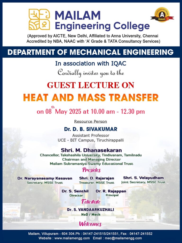 The Department of Mechanical Engineering is organizing a Guest Lecture on “Heat and Mass Transfer " for Mechanical Engineering students on 8th May 2025. Time: 10.00am to 12.30PM