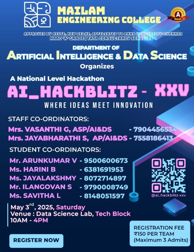 Organizing a three day Hackathon program through AI club titled AI_HACKBLITZ-XXV for Inter and Intra college students.