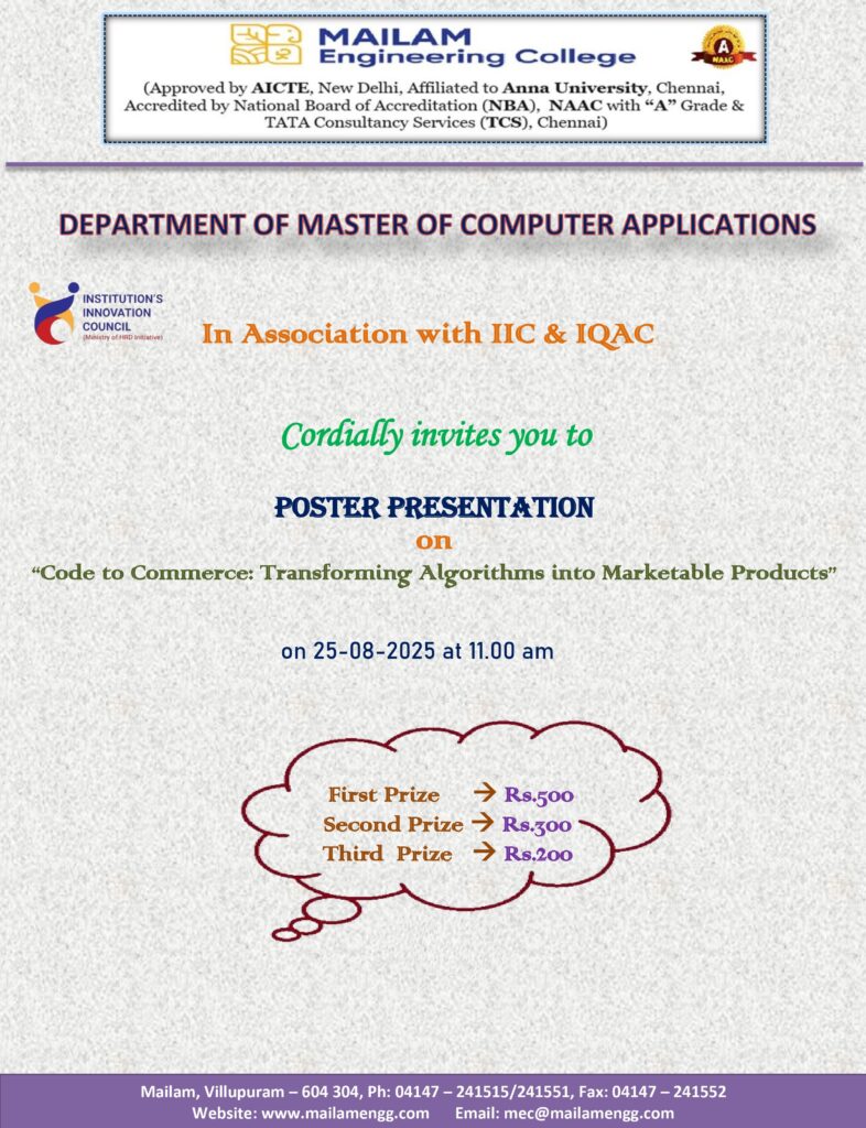 The Department of Master of Computer Applications, Mailam Engineering College, in association with IIC & IQAC, is organizing a Poster Presentation on “Code to Commerce: Transforming Algorithms into Marketable Products” for students on *25th August 2025 at 11:00 AM.