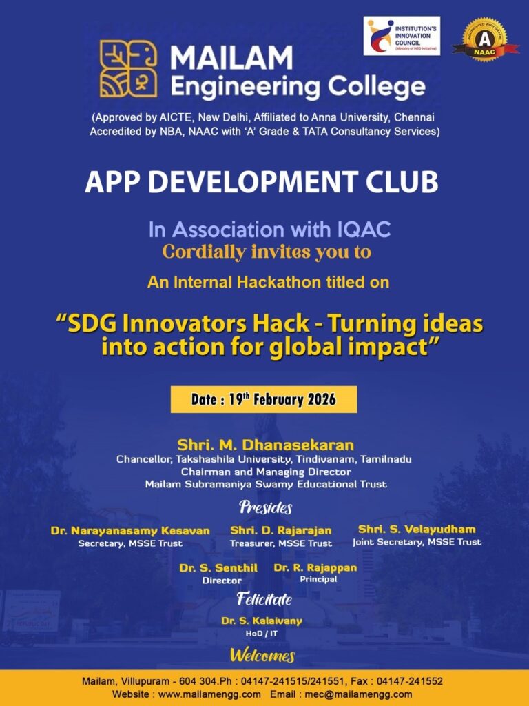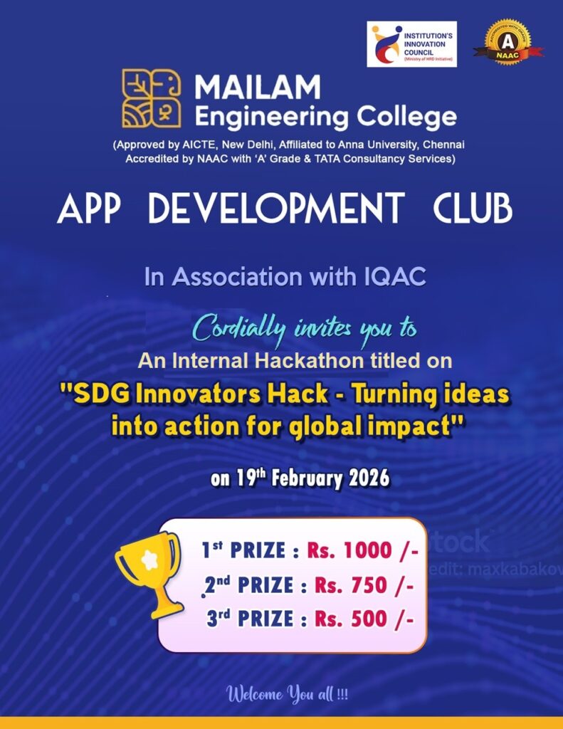 The App Development Club, in association with IQAC, is organizing an internal hackathon titled “SDG Innovators Hack – Turning Ideas into Action for Global Impact” for UG students on 19.02.2026.