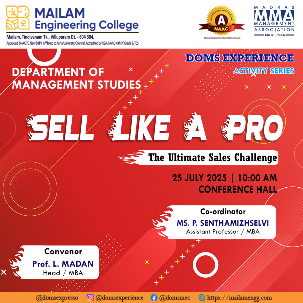 The Department of Management Studies organized “Sell Like a Pro – The Ultimate Sales Challenge” on July 27, 2025, as part of the DOMS Experience – Activity Series. The event was coordinated by Ms. P. Senthamizh Selvi, Assistant Professor, and featured Prof. L. Madan, HOD/MBA, as the resource person. This engaging session aimed to sharpen students’ sales skills through interactive challenges, real-world scenarios, and expert guidance, helping them build confidence and professional communication skills.