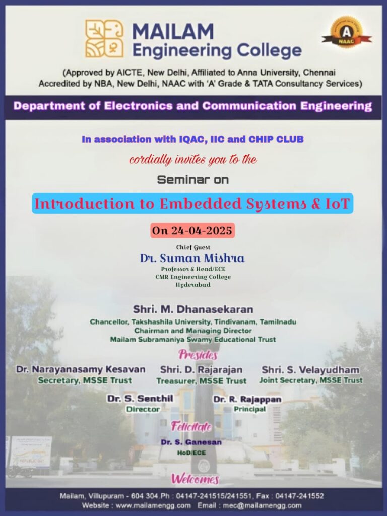 The Department of ECE in association with CHIP club is organising a seminar on “Introduction to Embedded systems and IoT” on 24.04.2025 .