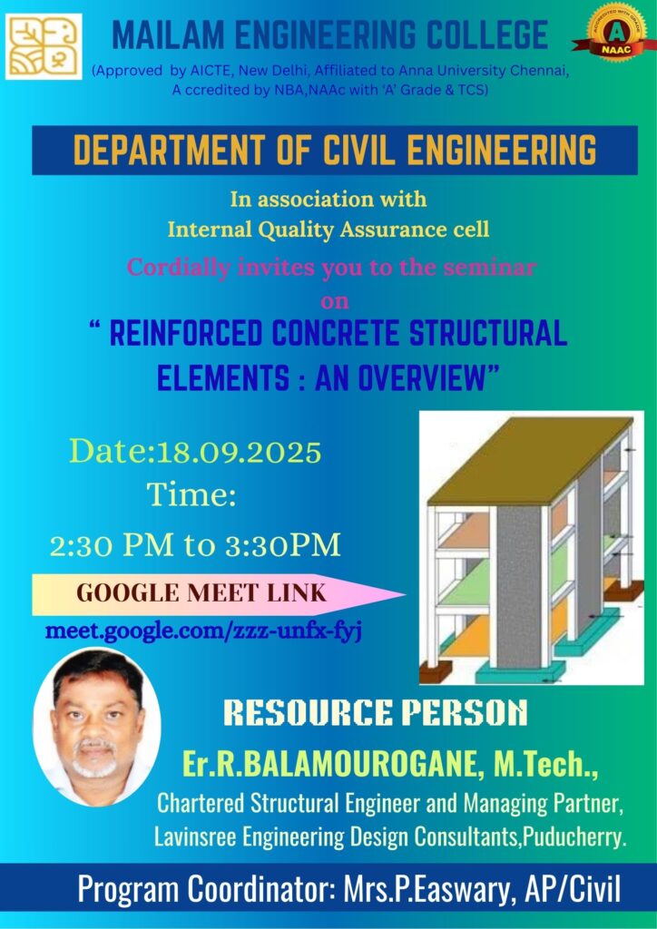 The Department of Civil Engineering, Mailam Engineering College, in association with the Internal Quality Assurance Cell, is organizing a seminar on “Reinforced Concrete Structural Elements: An Overview”. The session will be conducted by Er. R. Balamourogane, M.Tech., Chartered Structural Engineer and Managing Partner, Lavinsree Engineering Design Consultants, Puducherry. The seminar will be held online via Google Meet on 18th September 2025 from 2:30 PM to 3:30 PM.