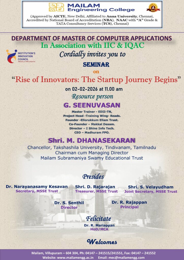The Department of Master of Computer Applications is organizing a seminar on Rise of Innovators: The Startup Journey Begins for MCA students on 02.02.2026 at 11.00 a.m. The seminar aims to create awareness about startups, innovation, and entrepreneurial thinking, and to motivate students to understand the initial stages of building and growing a startup.