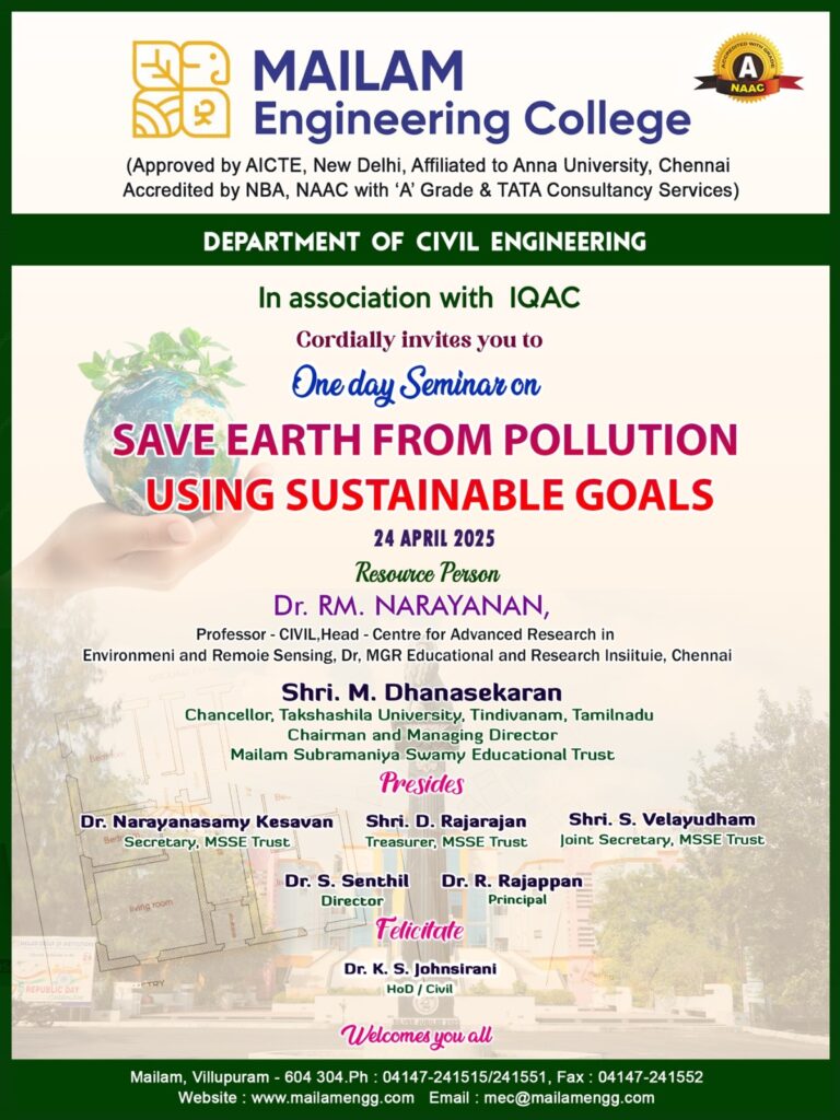 The Department of Civil Engineering is organizing a seminar on 'Save Earth from Pollution using Sustainable Goals' on 24th April 2025.