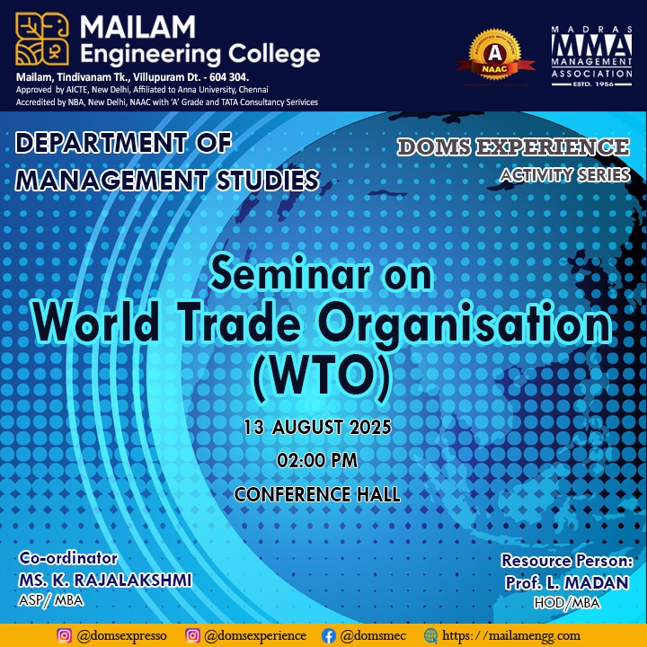 The Department of Management Studies at Mailam Engineering College, under the DOMS Experience – Activity Series, is hosting a Seminar on the World Trade Organisation (WTO) on Wednesday, 13th August 2025, at 02:00 PM in the Conference Hall. Coordinated by Ms. K. Rajalakshmi (ASP/MBA) and led by Prof. L. Madan (HOD/MBA) as the resource person, this session will provide valuable insights into the role, functions, and impact of the WTO in shaping global trade policies.