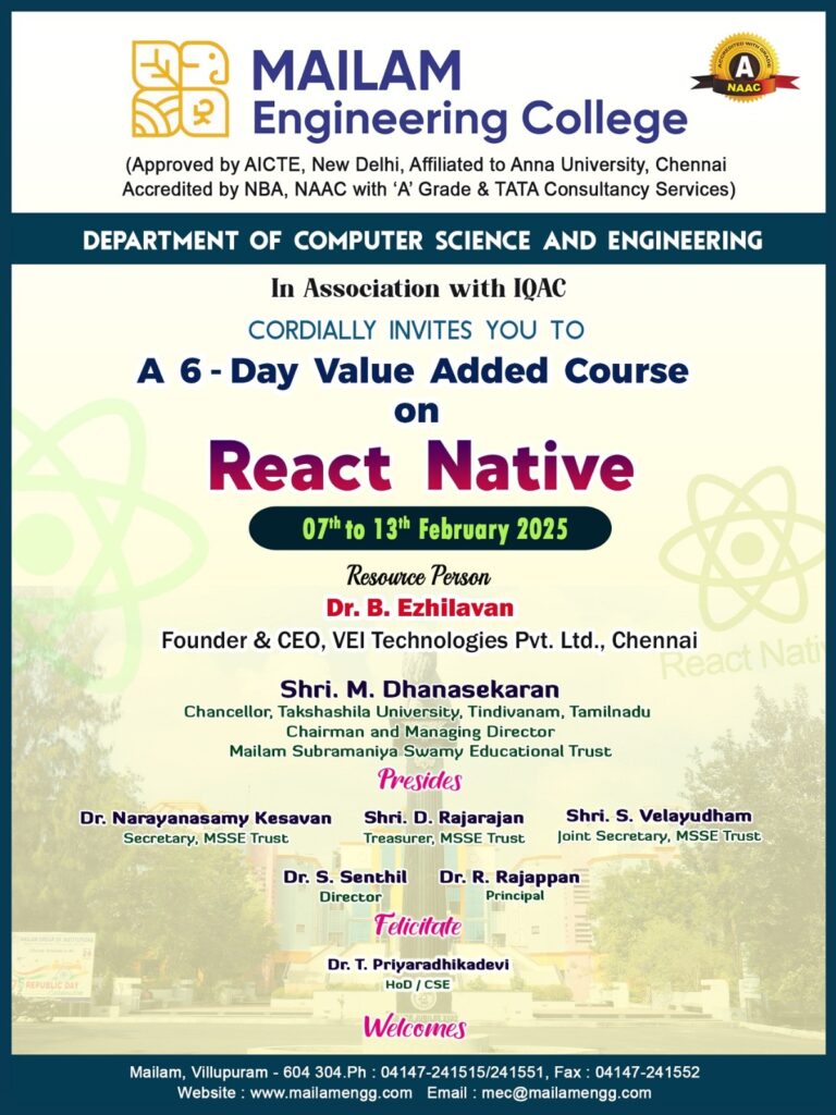 The Department of Computer Science and Engineering  is organized Six Days Value Added Course on “React Native” by Dr.B.Ezhilavan, Founder & CEO,VEI Technologies Pvt Ltd from 07.02.2025 to 13.02.2025.